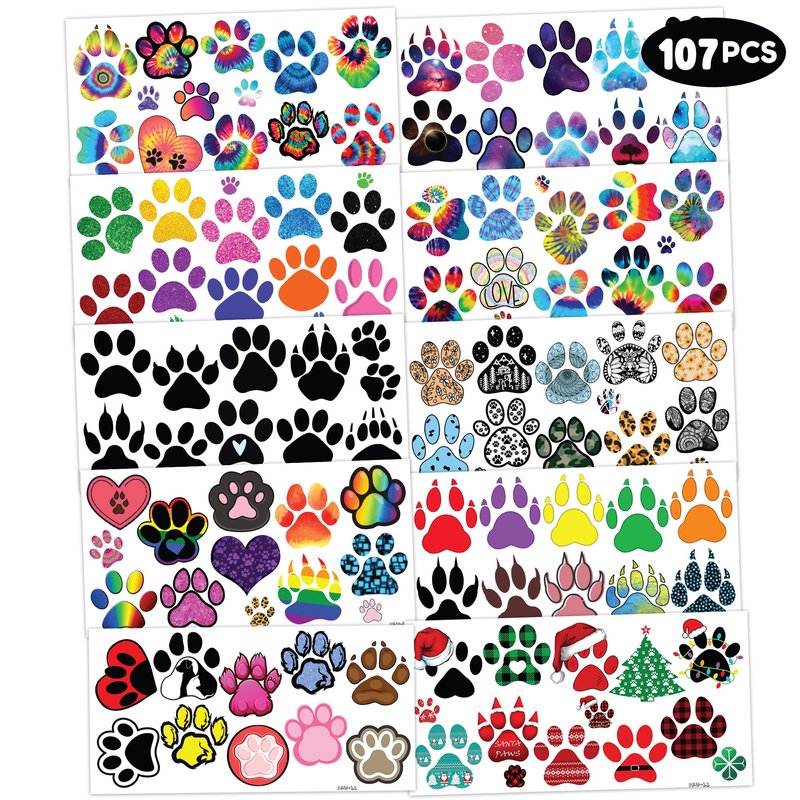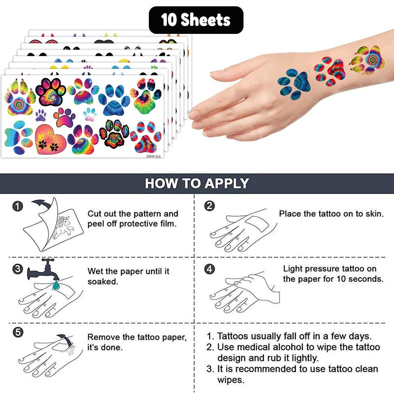 - 🐾TATTOOS FOR PAW PRINT THEMED DECORATION: PAW TATTOOS for people who love PAW, cat, pet, animal. Featuring 10 sheets with 107 pcs of lovely, fun and colorful design. Each sheet measures 6.1 * 3.1 inches. You can temporarily tattoo them on your body or objects such as phones, bottles, laptop…