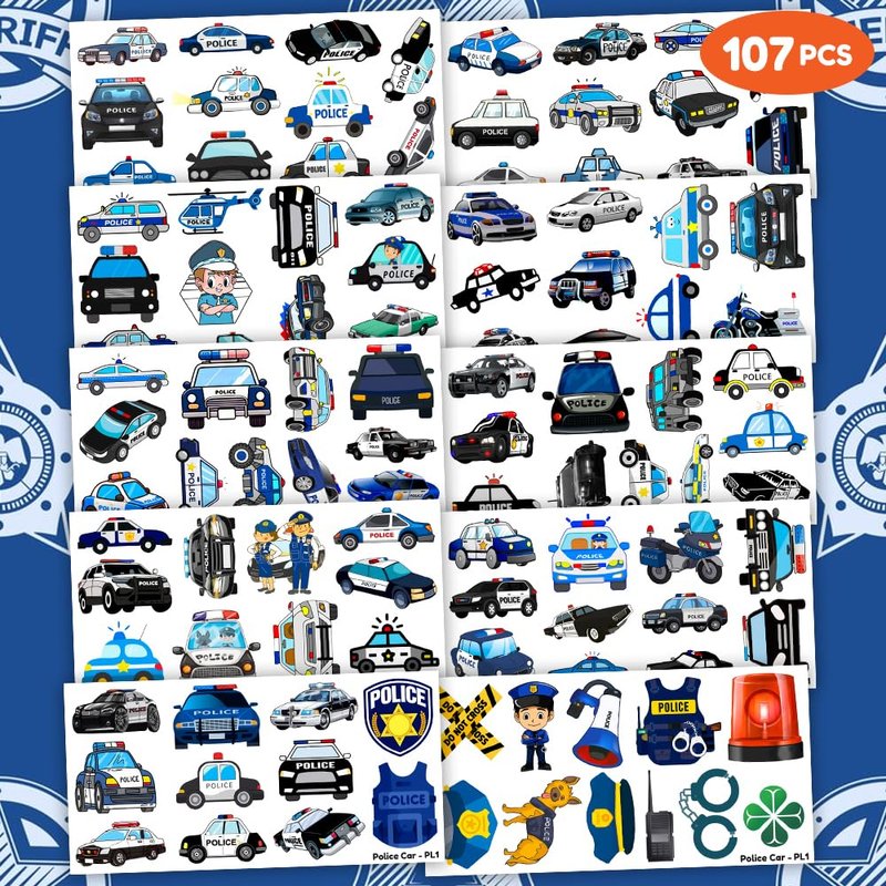 - Pattern rich: Police Car Cute Cop Officer Policeman Blue Temporary Tattoos include 10 Sheets 107 PCS, the size of each sheet is 6.1 * 3.1 inches. Easy to share,even if a lot of people's parties, you can have a different tattoo with others.These adorable tattoos will keep you and your little ones – and their friends – occupied for a while.