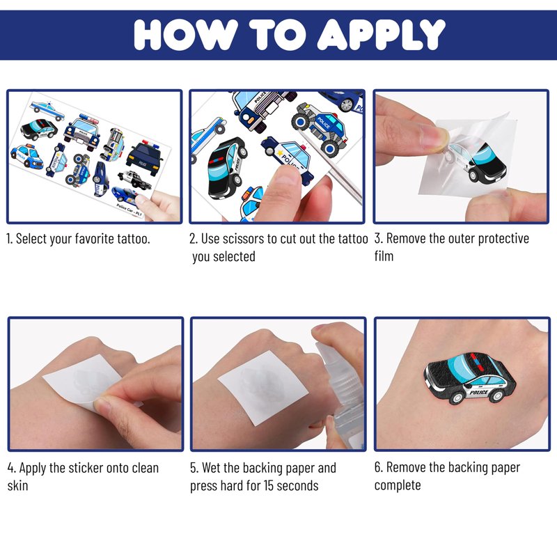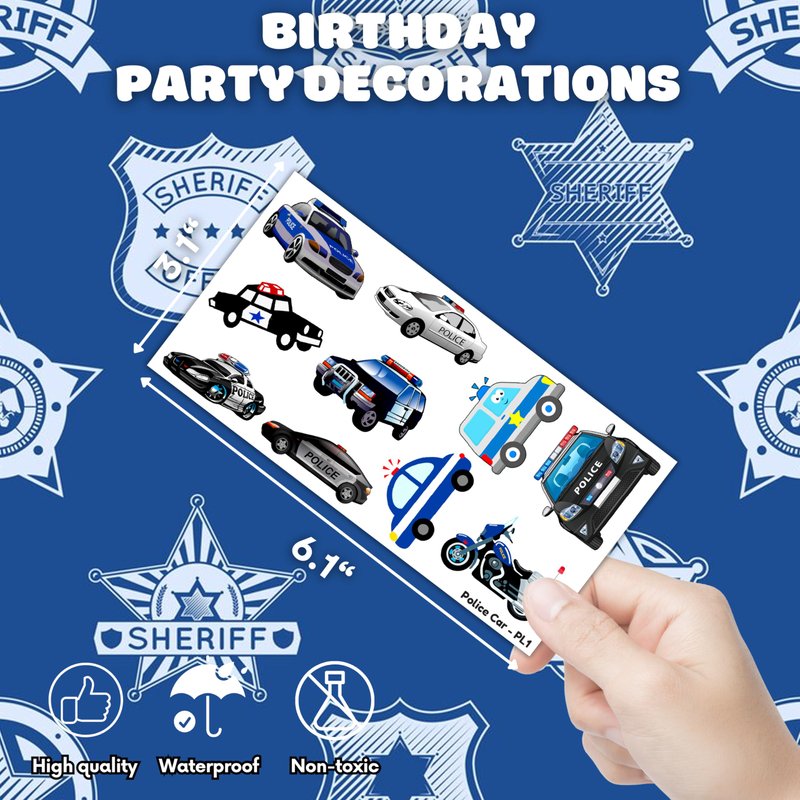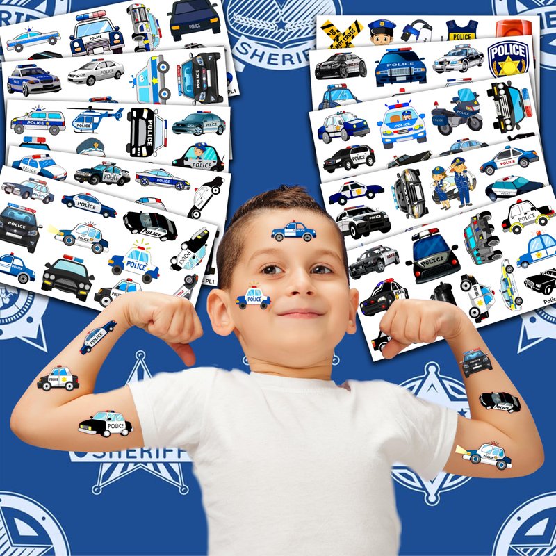 - Widely used: Police Car Cute Cop Officer Policeman Blue Temporary Tattoos pieces are suitable for many occasions such as birthday party supplies, party decorations, party favors, party bags, DIY decorations, pool and the beach or gift. Temporary tattoos are the best party favors and goodie bags fillers ever for any kind of celebration!