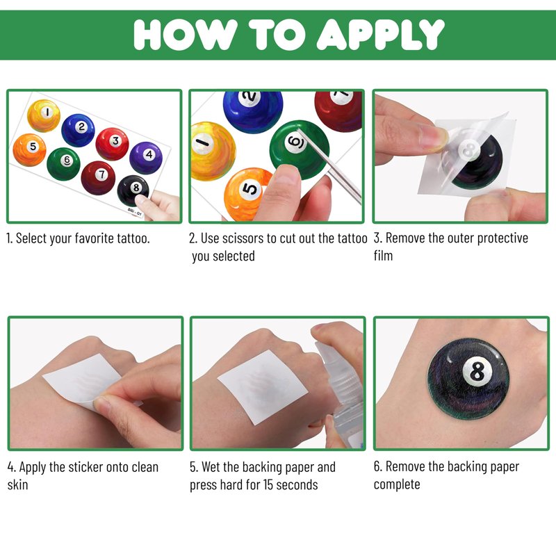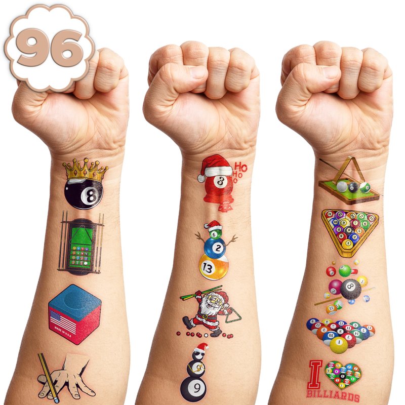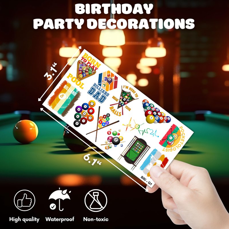 - Perfect Snooker Billiards Pool Ball Sports Lovers Game Birthday Decorations: All the temporary tattoos are design with many themed. Fits any smooth part: face, hands, arms, shoulders, back, legs water bottle, cup,mug and other stuff and so on. Great fun for party favors, birthday gift, clubs, festivals or party supplies,etc. and can be used by children, kids, girls, boys, women, men.