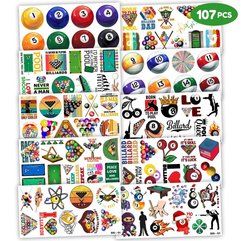 - Cute Snooker Billiards Pool Ball Sports Lovers Game Birthday Party Supplies: 10 sheets Snooker Billiards Pool Ball Sports Lovers Game theme temporary tattoos stickers, features an assortment of cute themed characters, each sheet measures 6.1 x 3.1 inch , all kinds of designs and colors will bring more fun to your party, one size fit all adult and kids.