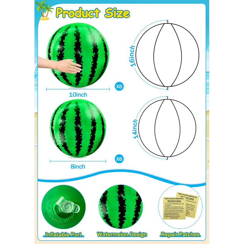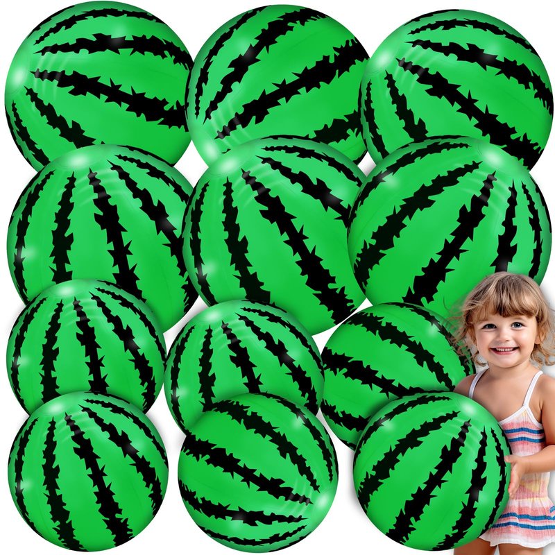 - 12 Pack Inflatable Watermelon Beach Ball Bulk: Package included 12 Pack watermelon beach balls, two different size: 10 inch(6), 8 inch(6). They add a fresh touch to summer hawaiian themed party. Note: Adult supervision all the times when kids are using