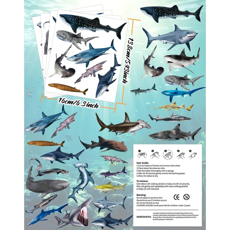 Quantity: 16 sheets Shark Decor temporary tattoos