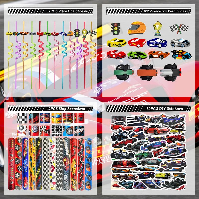 - Race Car Party Favors Package Including:12PCS Mini Race Car Toys,60PCS DIY Car Stickers,12PCS Slap Bracelets,12PCS Car Party Straws,12PCS Hot Wheels Party Pencil Caps.