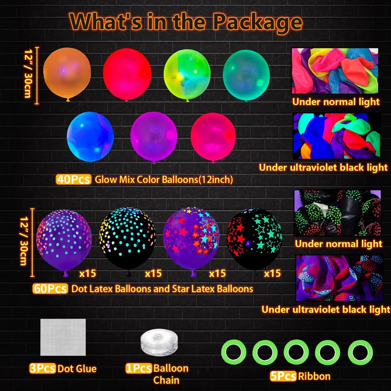 - Package Includes: 40 x 12” glow mixed color latex balloons; 30 x 12” polka dots latex balloons (15 purple, 15 black); 30 x 12” stars latex balloons (15 purple, 15 black); 5 x ribbons; 3 x dot glues (in slice); 1 x balloon chain. The party black light balloon sets are sufficient for decorating your party. The balloons measure approx. 12 inches when fully inflated, the perfect size that can combine to help create a joyful and romantic atmosphere, and both kids and adults will love them so much.