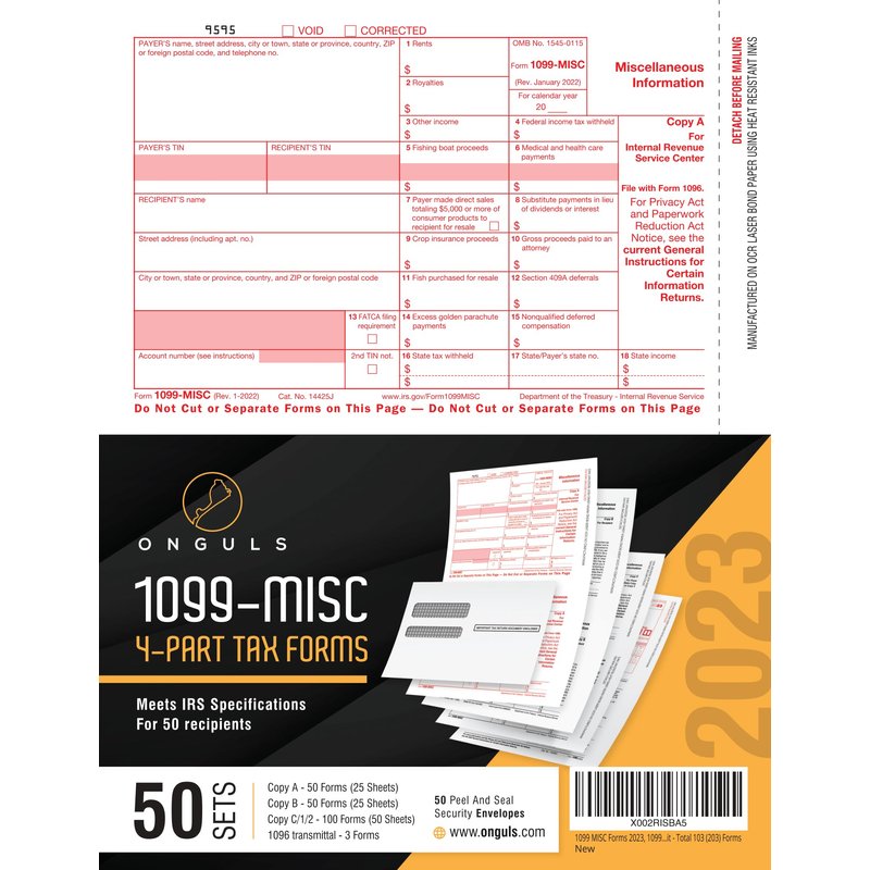 This 1099 tax forms set is especially designed to fully optimize your income filing in a rapid and reliable manner! These MISC forms include the 4-part 1099 and 3 transmittal 1096 documents, as well as 50 self-sealing PEEL and SEAL envelope, everything you need for successfully reporting your payments.