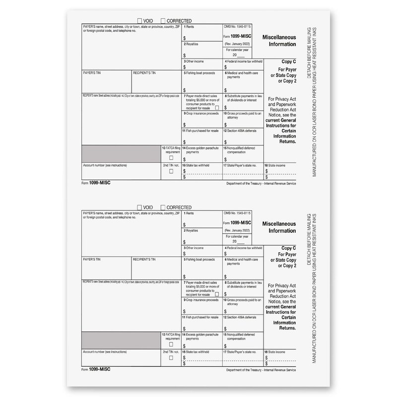 - 100 1099 MISC Copy C/2 Forms for State/Payer (50 sheets, 2 forms per sheet)