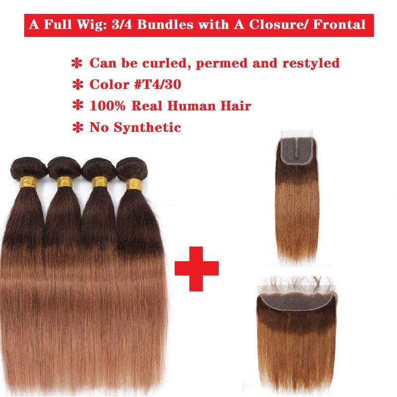 - Hair Color: ๐Ombre Color T4/30 Honey Brown Straight Human Hair. Can be Curled, Permed, Bleached, Highlighted, Curled or Styled Without Demage as Your Own Hair