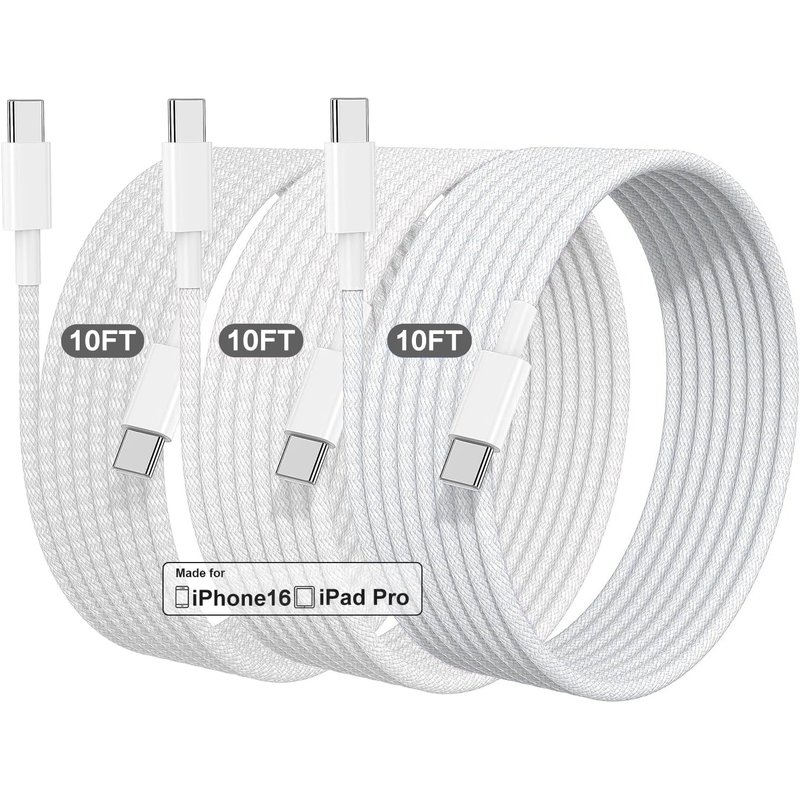 10FT Long USB C to USB C Charging Cable for iPhone 16 15, 3Pack 60W Type C to C uper Fast Charging Data Sync Braided Cable for iPhone 16/15 Pro Max, Vision Pro, iPad Pro Air mini, Airpods, Galaxy