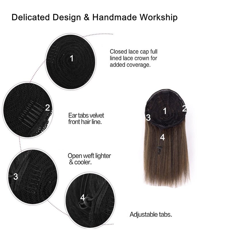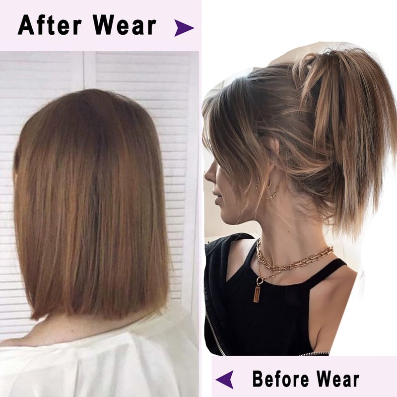 - 3.Easy to Wear a Drawstring Ponytail: First pull your hair back into a bun and secure , then cover the bun with pony cap ,Pull drawstring to secure cap around bun , Last Insert front clip then style for desired look, finish and perfect .