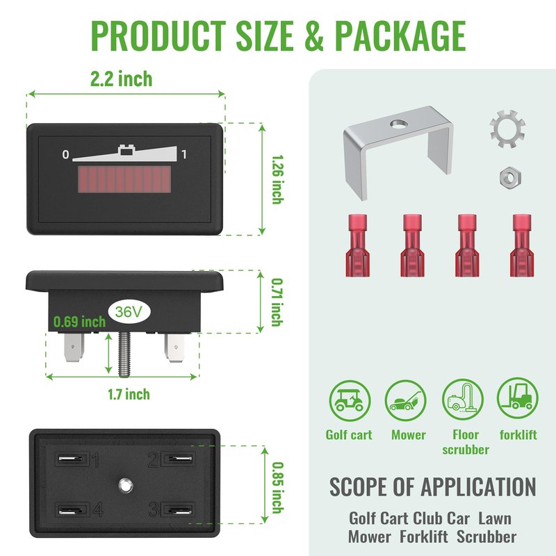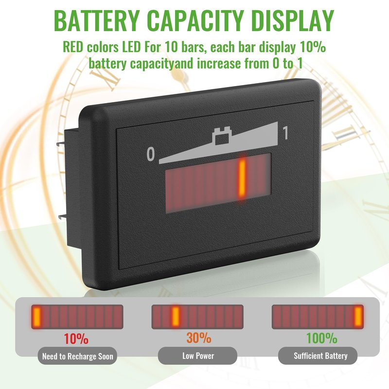 - 【Easy to install & Wide application】Simply connect the positive and negative poles of the power supply to the meter, if you need drawings, please contact customer service.Works with Lead-Acid Batteries in Golf Carts, Forklifts, Trucks, Scooters, Boats and More.