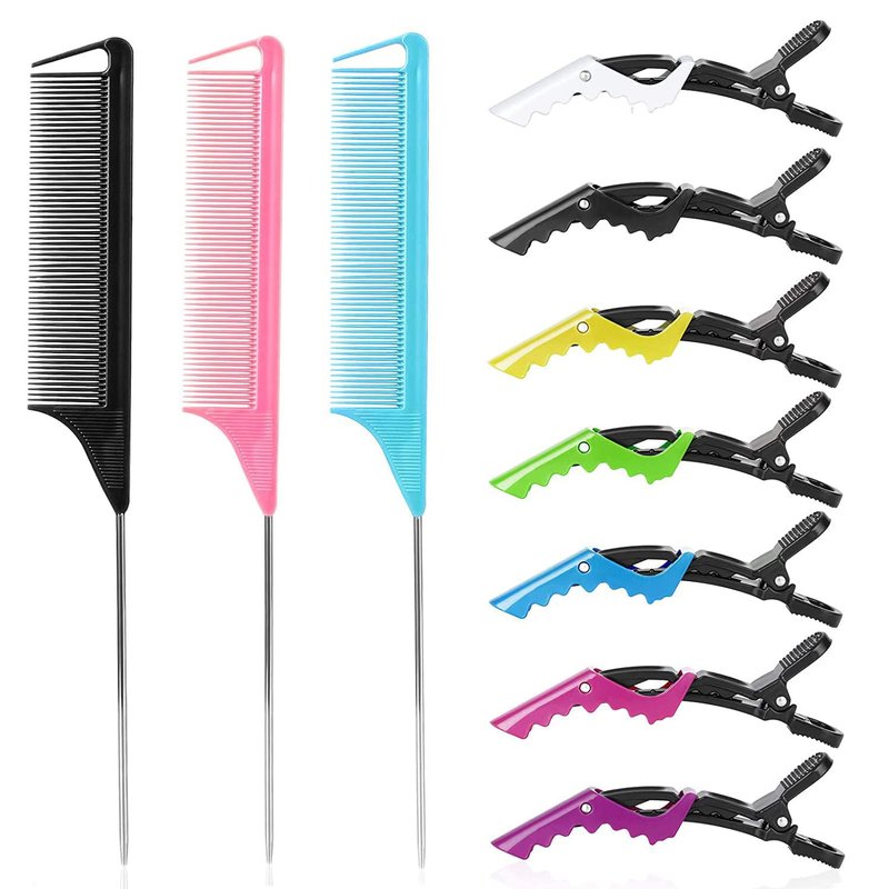 10Packs Rat Tail Comb Hair Clips Set,3Pcs Rat Tail Combs,Parting Comb and 7Pcs Alligator Styling Sectioning Clips of Professional Hair Salon Quality(Black,Pink,Blue)