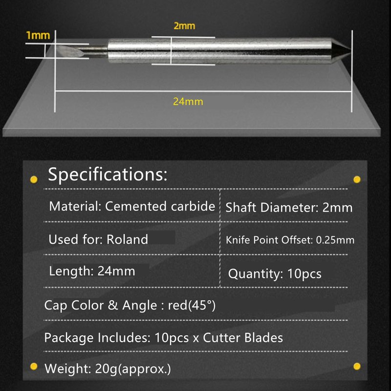 These blades are the standard blades that used for vinyl cutters. They are recommended for all standard cast and vinyls as well as other thin materials. The cutting blade quality is good with high hardness, greater strength, better abrasion resistance, high durable degree. The tip of the blade is very sharp.