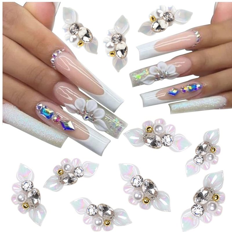 10PCS 3D Nail Charms Flower Nail Art Charms for Nail Gems and Rhinestones for Nail Pearls Crystals Design Nail Art Decorations Nail Jewels Accessories DIY Acrylic Nail Supplie White