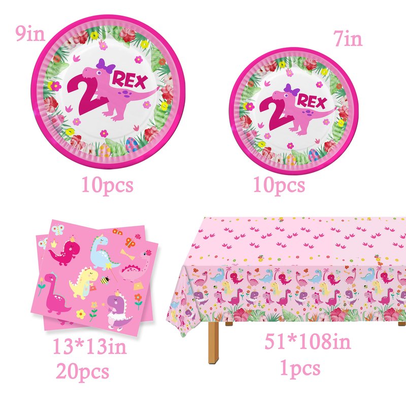- You will get: 10 9" Dinosaurs 2 plates, 10 7" Dinosaurs 2 plates, 1 Pink Dinosaur Tablecloth, 10 Dinosaur Tissues.