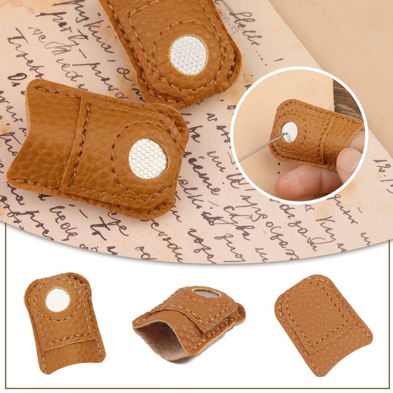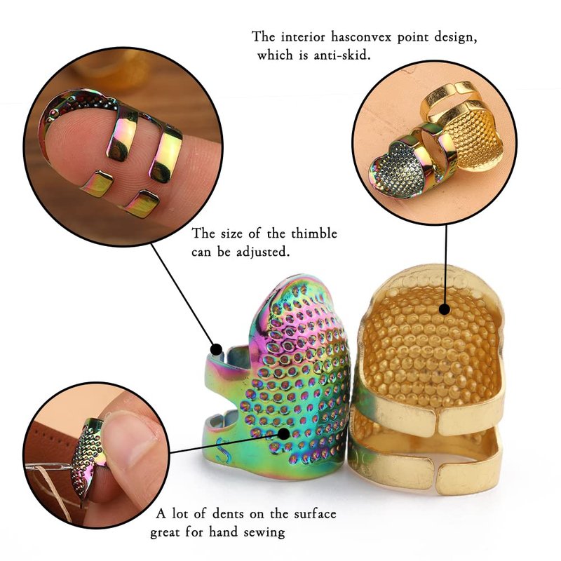 Package Included:2pcs sewing thimbles finger protector(golden + Dazzle Color)2PCS Generic Thickened Sewing Thimbles (golden + silver)2pcs ring sewing thimbles(golden + silver) 2pcs Leather finger protectors(Large +small)2pcs sewing thimble cap(silver+copper)Features:1.Made of copper, strong and durable, not easy to rust, long-lasting. 2.The size of finger sleeve can be adjusted. Designed for comfort to prevent your fingers from sweating. 3.Very useful sewing tool to protect fingers while sewing. Suitable for needlework, sewing, embroidery and other uses. 4.This finger protectors set is available in a variety of sizes.