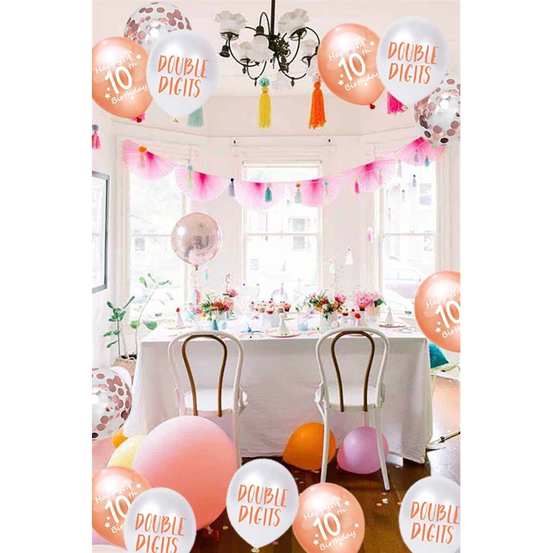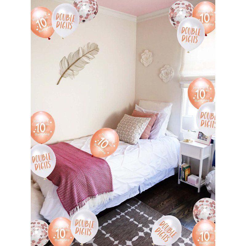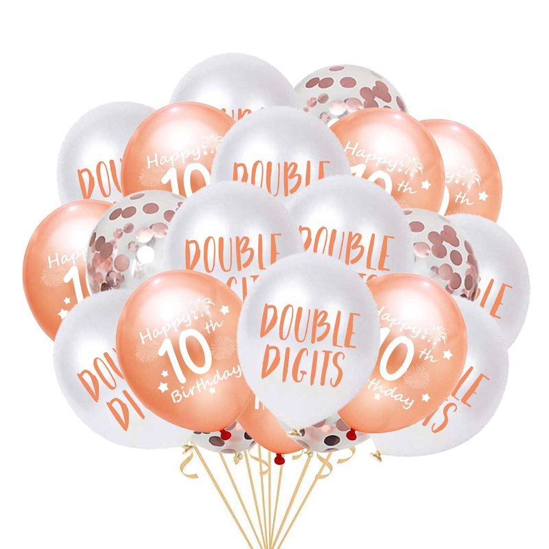 - Rose Gold 10th Birthday Balloons Package includes: 10pcs happy 10th birthday latex balloons in blue color, 10pcs double digits rose gold balloons, 5pcs rose gold confetti balloons, 1 ribbons, total 26pcs in one pack.