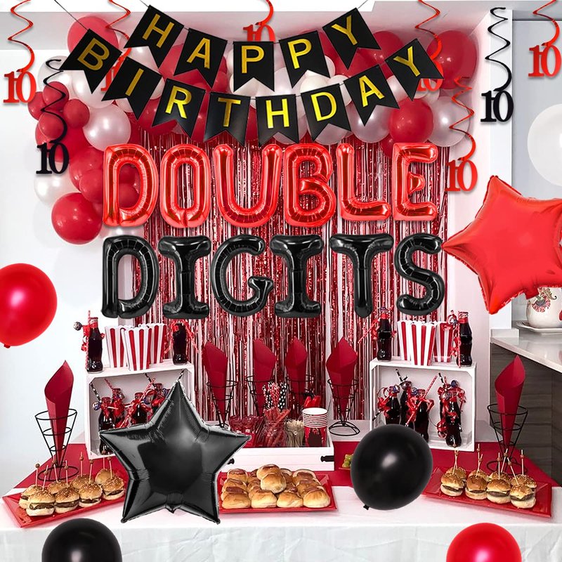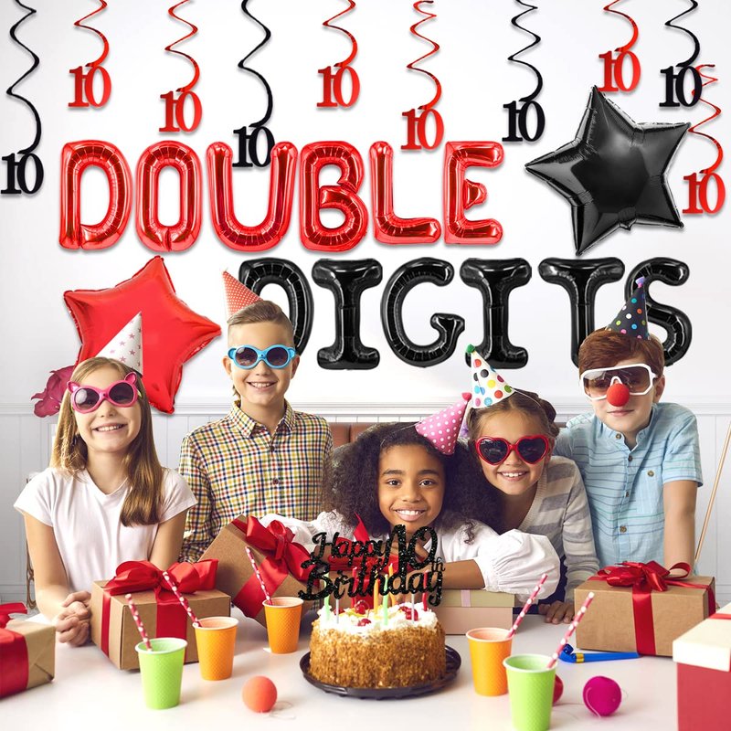10th Birthday Decorations for Boys Red and Black Double Digits Birthday Party Supplies 10 with Double Digits Foil Balloons Hanging Swirls Happy Birthday Cake Topper Banner for 10 Years Old