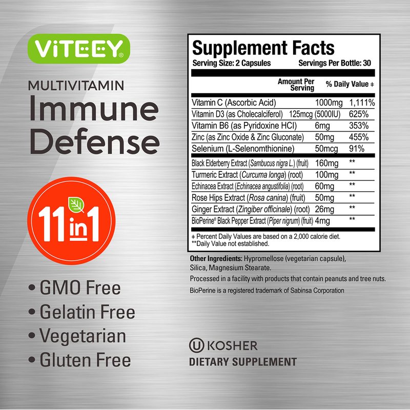 - POWERFUL IMMUNE SUPPORT BOOSTER - With Vitamin C 1000mg, Vitamin D3 125mcg 5000IU, Vitamin B6 6mg, Zinc 50mg, Elderberry 160mg, Turmeric Root 100mg, Echinacea 60mg, Rose Hips 50mg, Ginger Root 26mg, Selenium 50mcg & BioPerine 4mg, Viteey's Immune Support booster delivers the prefect combination to help boost your immune system and overall health, Viteeys capsule ingredients are perfectly Formulated and combined for adults and teens.