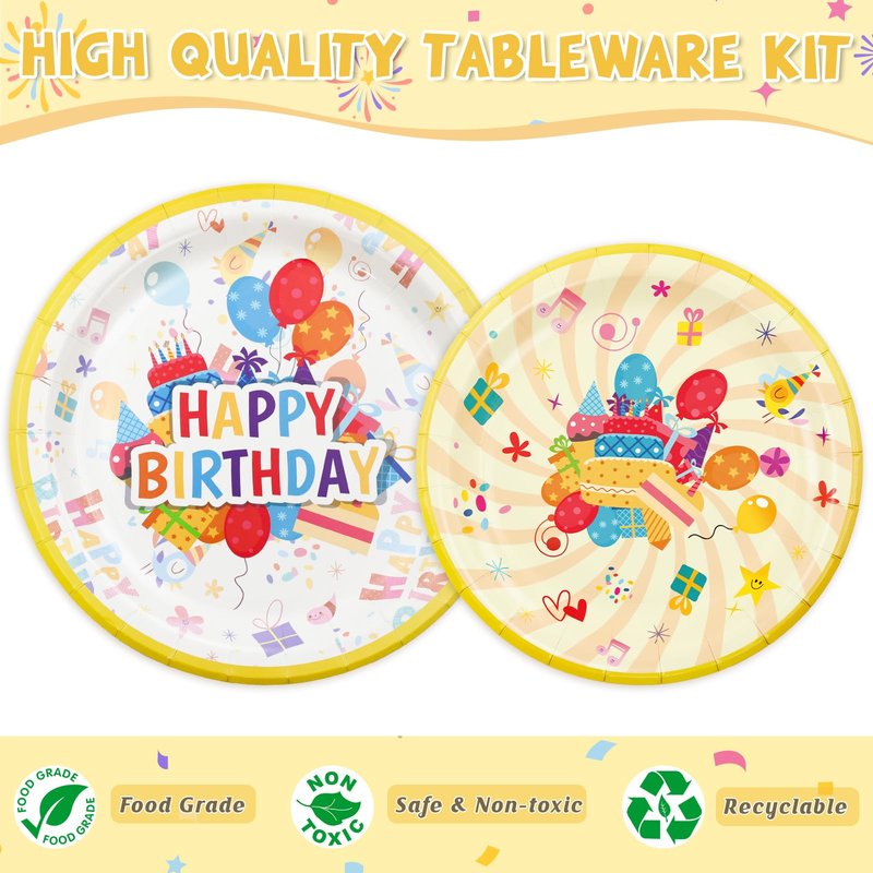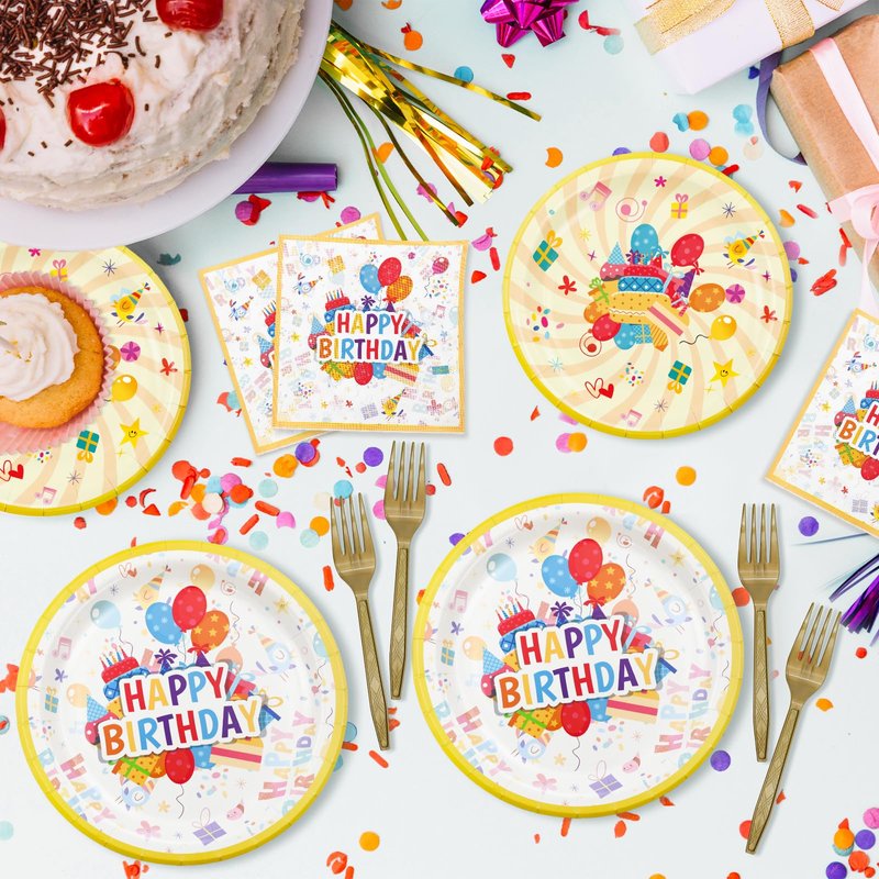 - BIRTHDAY PARTY TABLE DECOR - Our disposable paper birthday plates feature colorful designs inspired by classic birthday celebration elements.Each plate is decorated with cute cakes,colorful balloons and exquisite gift patterns,creating a joyful party atmosphere and making every birthday celebration more lively and interesting
