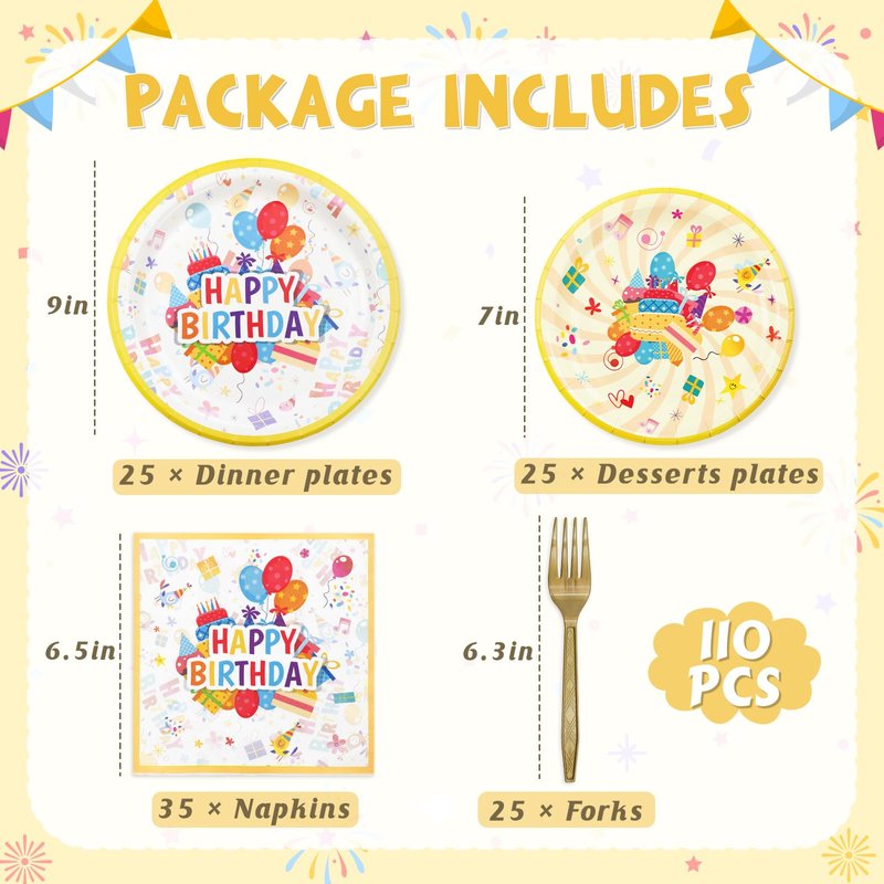 - BIRTHDAY PARTY SET - This comprehensive birthday party supplies includes 25 pieces of 9-inch dinner paper plates,25 pieces of 7-inch paper dessert plates,35 pieces of napkins (size 6.5x6.5inch),25 pieces of forks