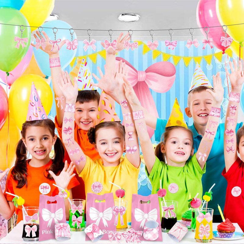 - Pink Bow Party Favors: These bow decorations for party design with various pink bow styles, accompanied by a collection of cute girly bows, fashion and chic, which can keep themselves attractive and charming for a long time and bring an extra dose of joy and elegance to the party