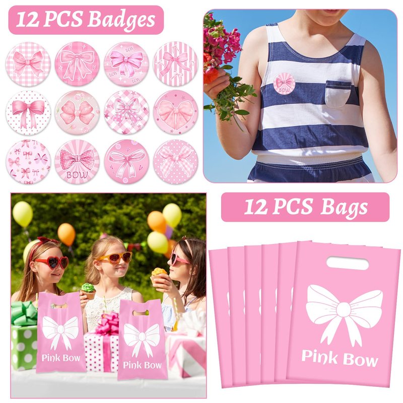 - Package Include: The pink coquette bow party favors contain 12 sheet pink bow temporary tattoos, 12 pcs pink bow slap bracelets, 50 pcs pink bow stickers, 12 pcs pink bow acrylic keychains, 12 pcs pink bow badges, 12 pcs pink bow gift bags, Enough quantity to meet your pink bow party needs
