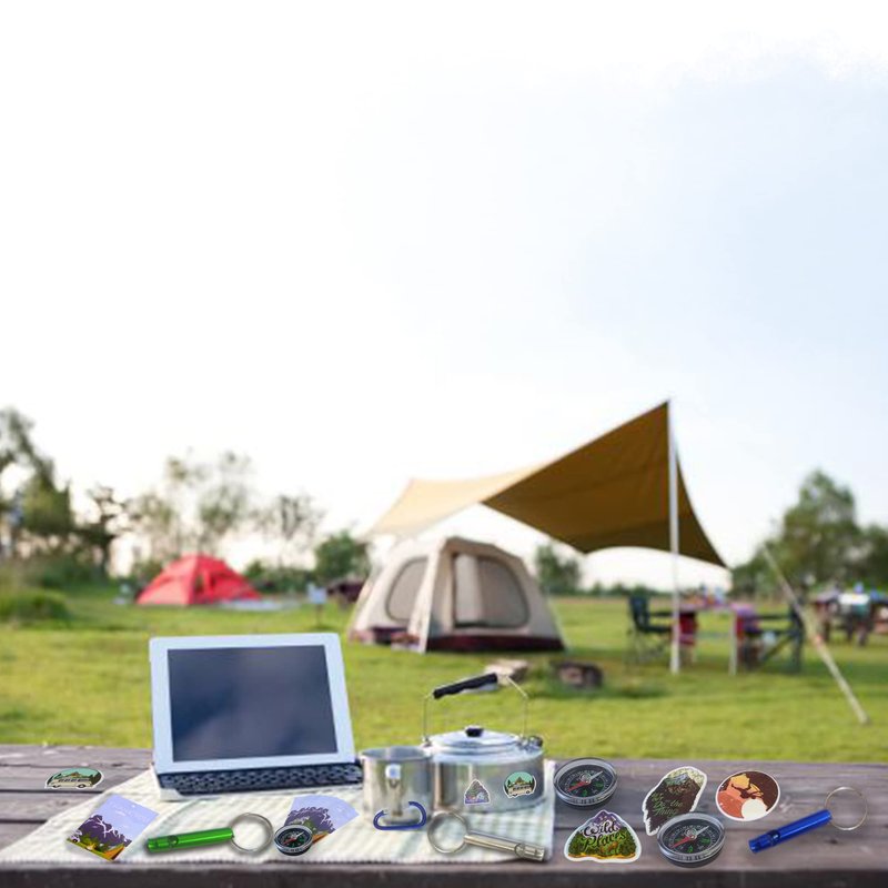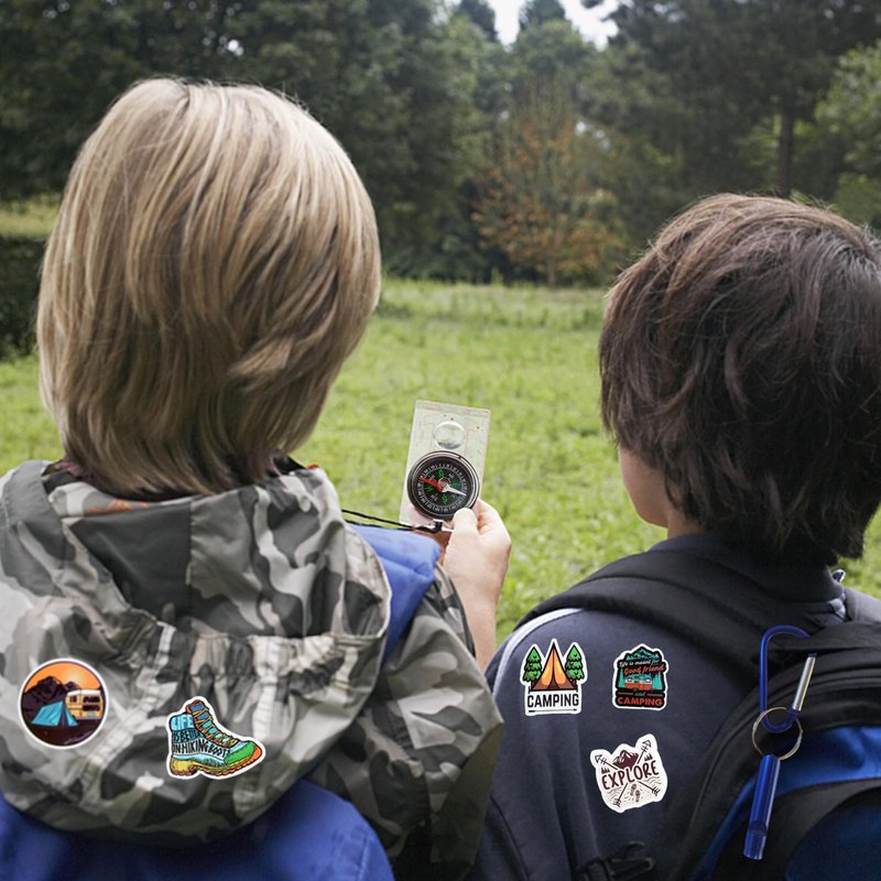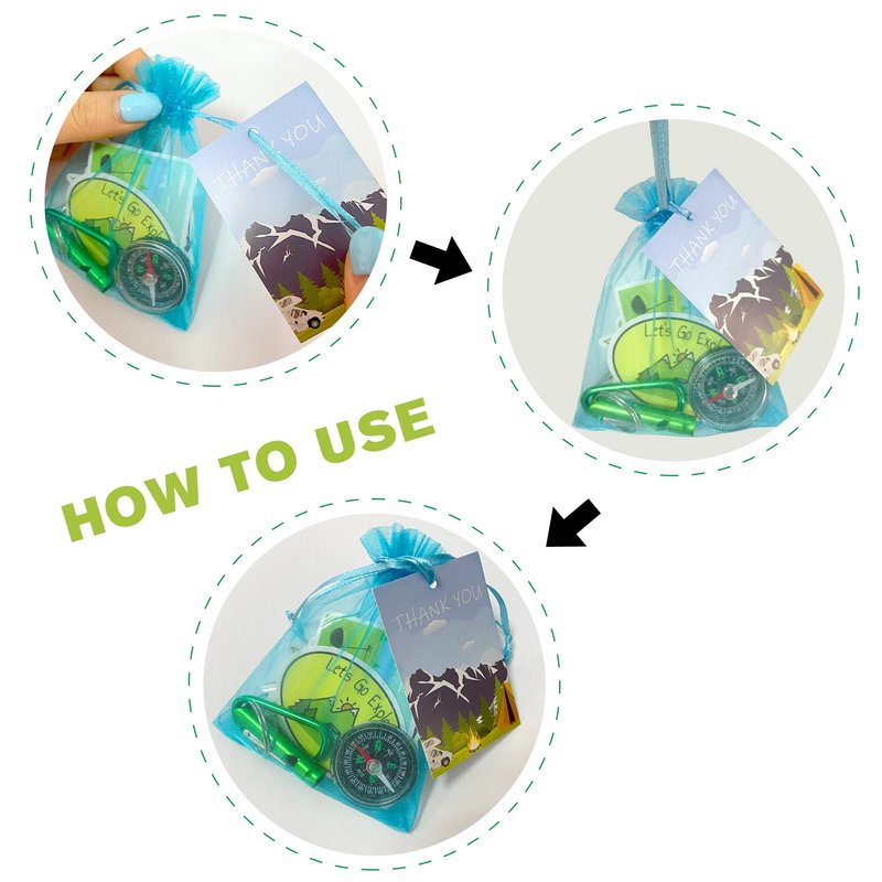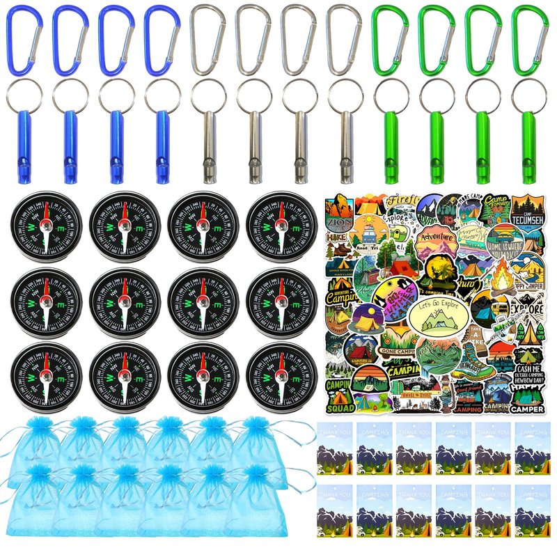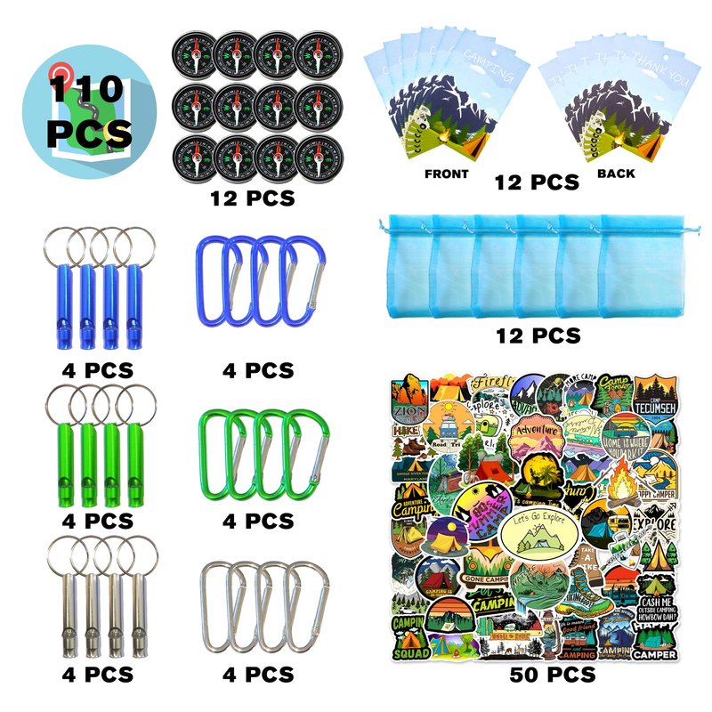 - PACKAGE: Compass toy x 12pcs, aluminum alloy whistle x 12pcs, carabiner x 12pcs, camping cards x 12pcs, organza bag x 12pcs, camping stickers x 50pcs.