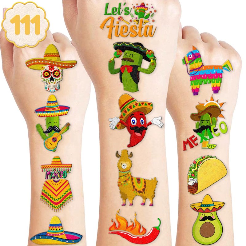 111 PCS Mexican Fiesta Temporary Tattoos Stickers Theme Birthday Party Decorations Supplies Favors Decor Taco Mexico Cinco De Mayo Pinata Tattoo Sticker Gifts For Boys Girls School Prizes Carnival