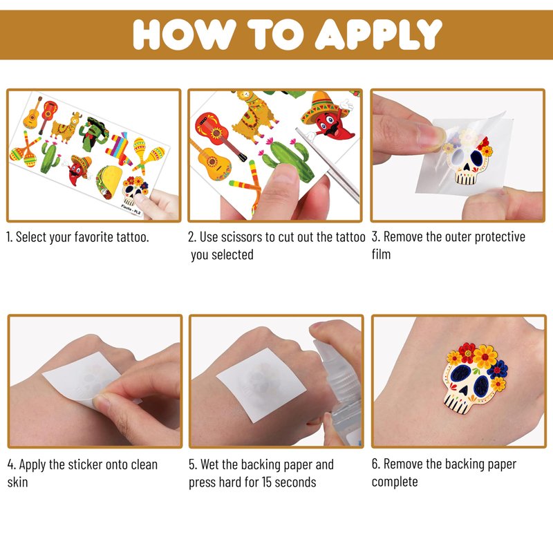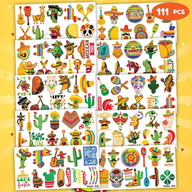 - Pattern rich: Mexican Fiesta Taco Mexico Cinco De Mayo Pinata Temporary Tattoos include 10 Sheets 111 PCS, the size of each sheet is 6.1 * 3.1 inches. Easy to share,even if a lot of people's parties, you can have a different tattoo with others.These adorable tattoos will keep you and your little ones – and their friends – occupied for a while.