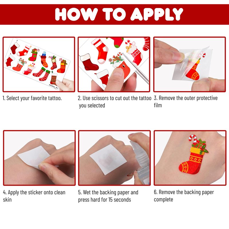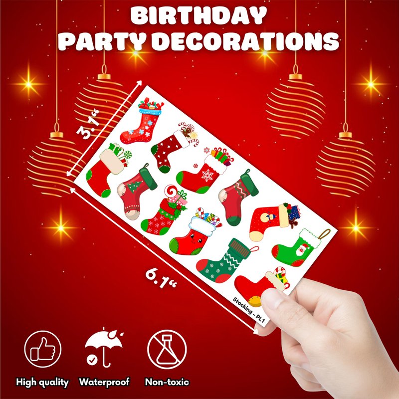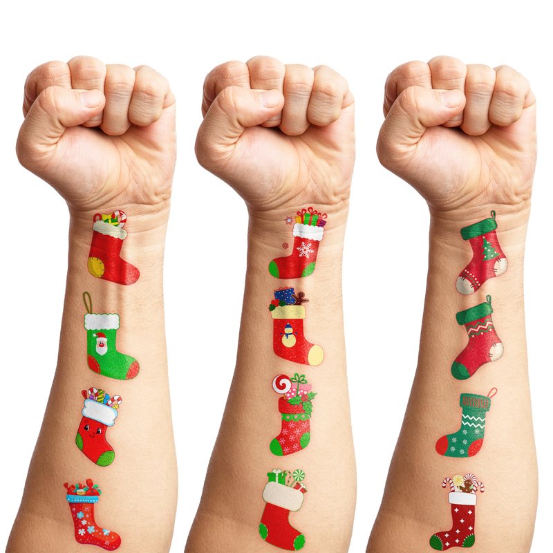 - Widely used: Christmas Stocking Red Xmas Sock Temporary Tattoos pieces are suitable for many occasions such as birthday party supplies, party decorations, party favors, party bags, DIY decorations, pool and the beach or gift. Temporary tattoos are the best party favors and goodie bags fillers ever for any kind of celebration!