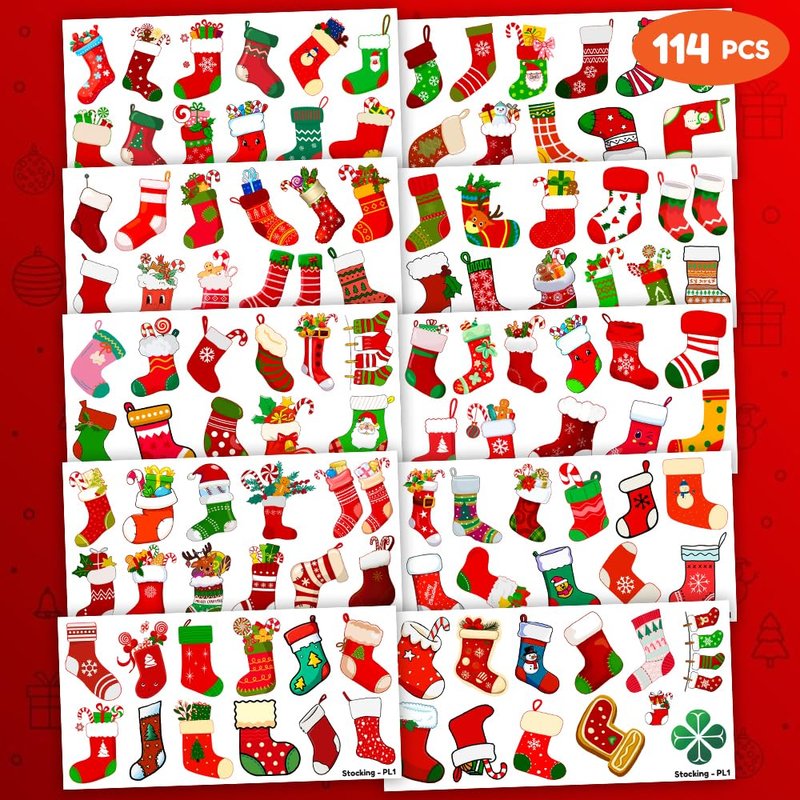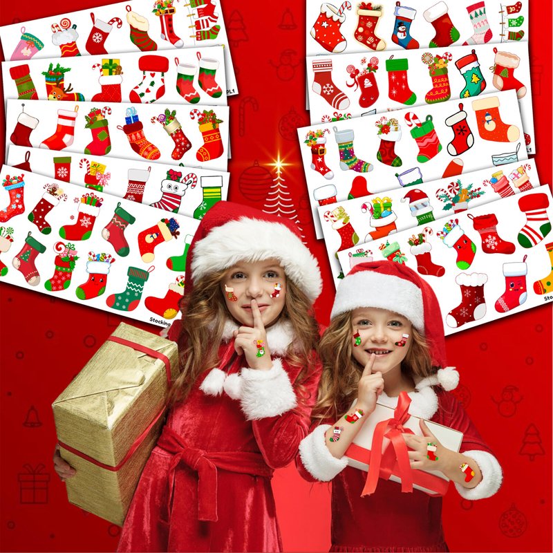 - Pattern rich: Christmas Stocking Red Xmas Sock Temporary Tattoos include 10 Sheets 114 PCS, the size of each sheet is 6.1 * 3.1 inches. Easy to share,even if a lot of people's parties, you can have a different tattoo with others.These adorable tattoos will keep you and your little ones – and their friends – occupied for a while.