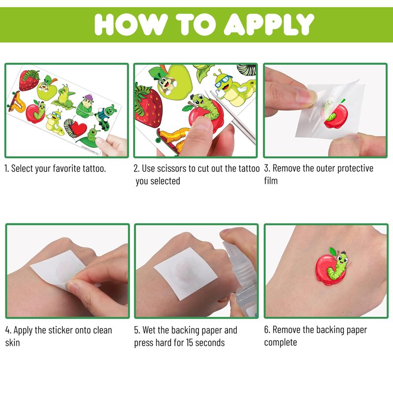- 🐛 EASY TO USE AND REMOVE : You can place them on your hands, arms, face, or any comfortable area. Simply cut out each tattoo from the sheets and remove the clear protective layer. Wet the tattoo thoroughly with water, wait for 20-30 seconds, and then remove the backing paper. The result will be a velvety, long-lasting tattoo.