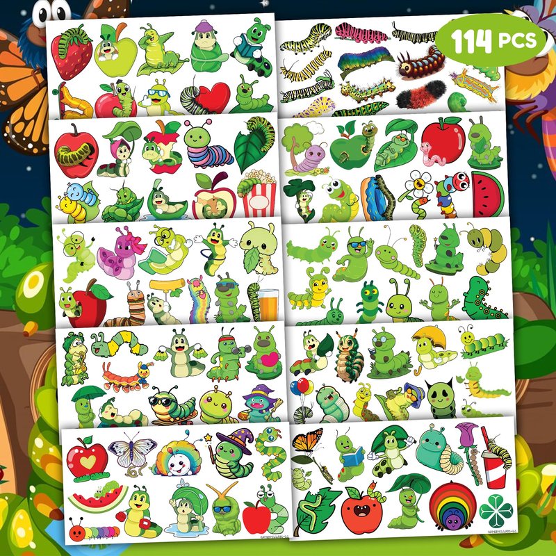 - 🐛TATTOOS FOR CATERPILLAR THEMED DECORATION: CATERPILLAR TATTOOS for people who love caterpillar. Featuring 10 sheets with 114 PCS of lovely, fun and colorful design. Each sheet measures 6.1 * 3.1 inches. You can temporarily tattoo them on your body or objects such as phones, bottles, laptop…