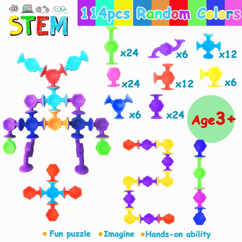 - 🌈 【STEM SUCTION CUP TOYS】114pcs small suction toys enough for kids to create more possibilities. This Fidget sensory toy is a super popular family interactive toy. The toys come in 8 colors and 8 shapes and build, stick, connect, and pop! Birthday gift for kids baby toddlers age 3 years old boy and girls. Not for Teething!