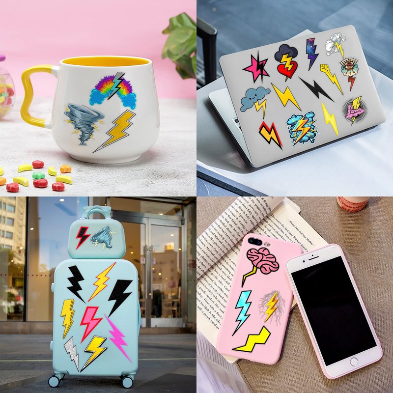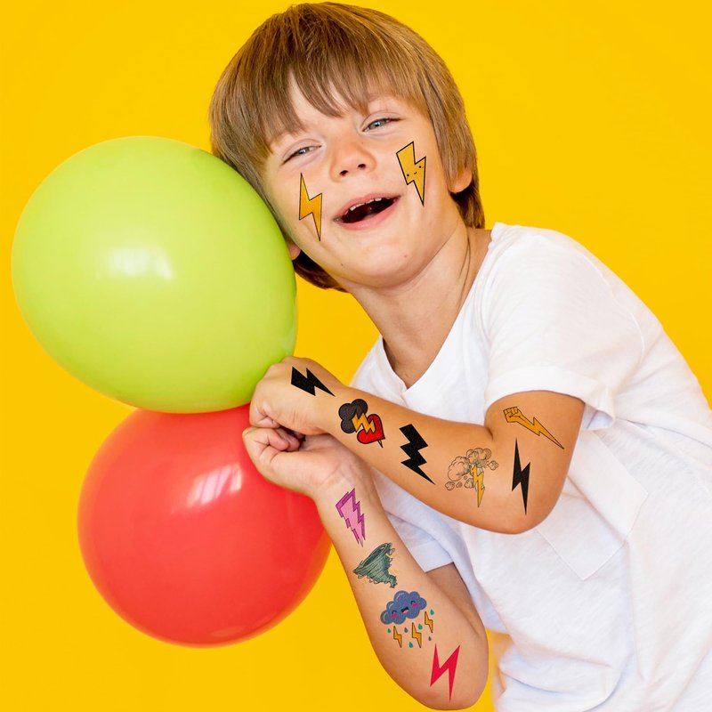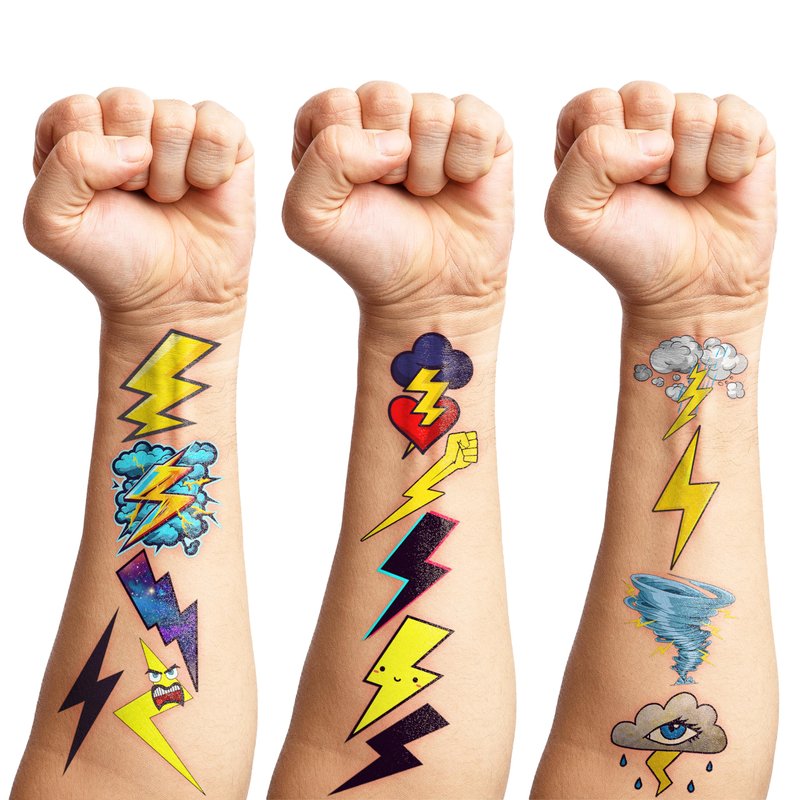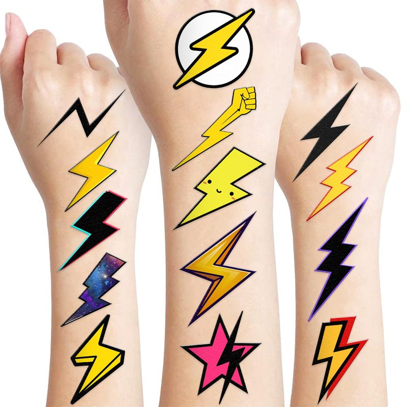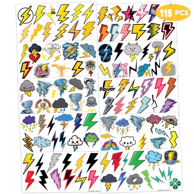 - ⚡TATTOOS FOR LIGHTNING BOLT THEMED DECORATION: LIGHTNING BOLT for people who love strength, likes to explore natural phenomena: lightning bolt, tornado… Featuring 10 sheets with 115 pcs of lovely, fun and colorful design. Each sheet measures 6.1 * 3.1 inches. You can temporarily tattoo them on your body or objects such as phones, bottles, laptop…