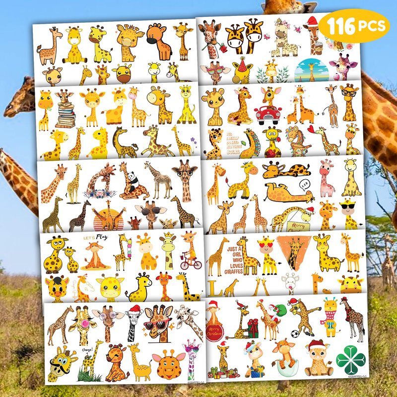 - 🦒TATTOOS FOR GIRAFFE THEMED DECORATION: GIRAFFE TATTOOS for people who love Animal, Giraffe. Featuring 10 sheets with 116 pcs of lovely, fun and colorful design. Each sheet measures 6.1 * 3.1 inches. You can temporarily tattoo them on your body or objects such as phones, bottles, laptop…
