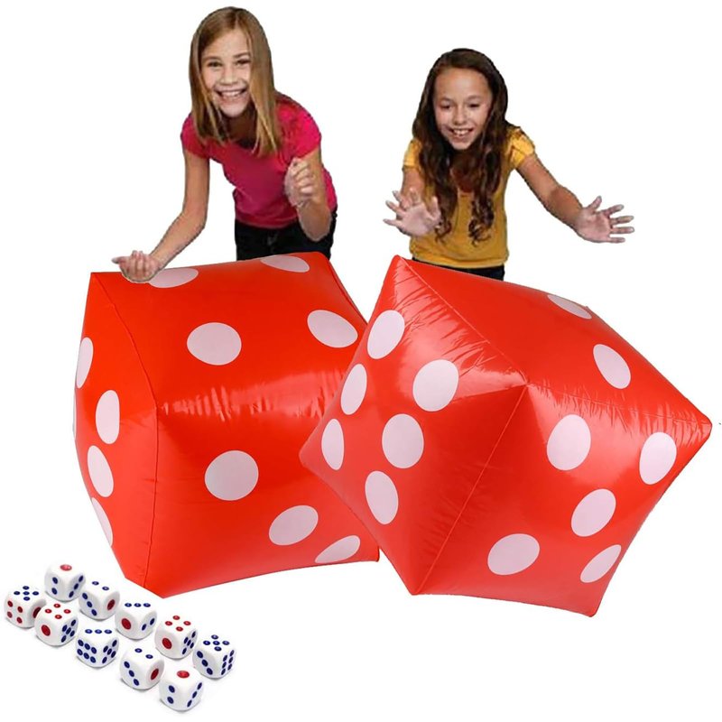 Inflatable Dice: material: pvc, dimensions: approx.11.8" x 11.8" x 11.8"(inflated), color: red Package Include: 2pcs inflatable dices with large size; There are also 10 plastic dice(Enrich your party) No leak: with a long enough plug to block up the inflatable port, make sure no leaking Safe Materials: These dice are made of safe 18 silk high quality PVC. Just fill them using a hair dryer or air compressor for instant fun! Perfect for: Games, Pool Parties, Birthday Parties, Travel, Beach, Learning, Water Game Toy, Educational Prop, Activities Tools At Club And Other Parties.11.8" Jumbo Inflatable Dice, 2pack Outdoor Fun Giant Inflatable Dice Set and 12mm 10pcs Dice for Indoor and Outdoor Broad Game, Ludo and Pool Party (Red)Inflatable Dice: material: pvc, dimensions: approx.11.8" x 11.8" x 11.8"(inflated), color: red Package Include: 2pcs inflatable dices with large size; There are also 10 plastic dice(Enrich your party) No leak: with a long enough plug to block up the inflatable port, make sure no leaking Safe Materials: These dice are made of safe 18 silk high quality PVC. Just fill them using a hair dryer or air compressor for instant fun!