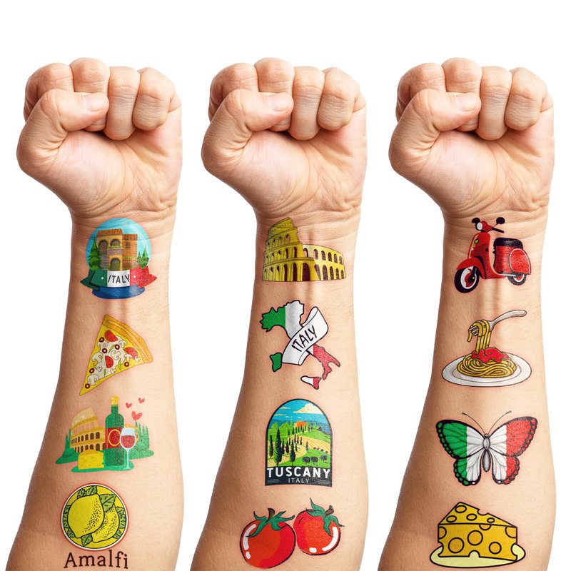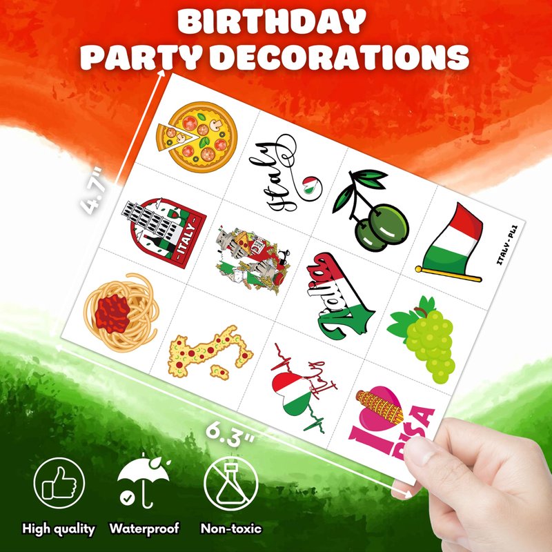 - Widely used: Italian Italy Rome Cute Flag Inspiring Temporary Tattoos pieces are suitable for many occasions such as birthday party supplies, party decorations, party favors, party bags, DIY decorations, pool and the beach or gift. Temporary tattoos are the best party favors and goodie bags fillers ever for any kind of celebration!