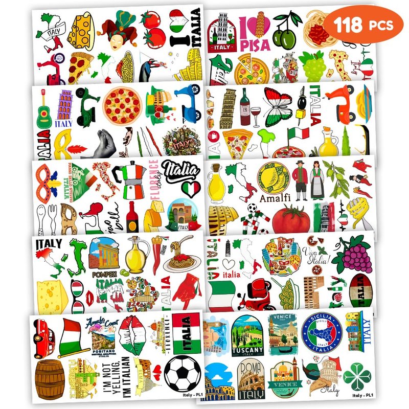 118 PCS Italian Italy Rome Temporary Tattoos Themed Birthday Party Decorations Supplies Favors Décor Cute Flag Inspiring Tattoo Stickers Gifts For Game Boys Girls Classroom School Prizes Reward