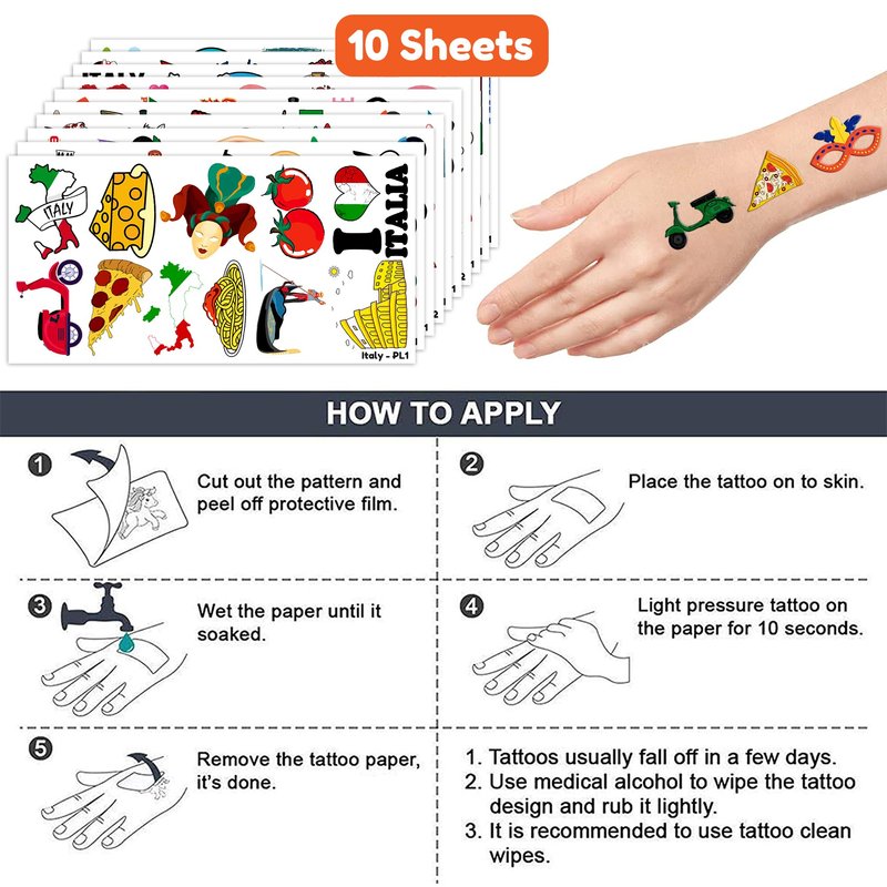 - Pattern rich: Italian Italy Rome Cute Flag Inspiring Temporary Tattoos include 10 Sheets 118 PCS, the size of each sheet is 6.1 * 3.1 inches. Easy to share,even if a lot of people's parties, you can have a different tattoo with others.These adorable tattoos will keep you and your little ones – and their friends – occupied for a while.