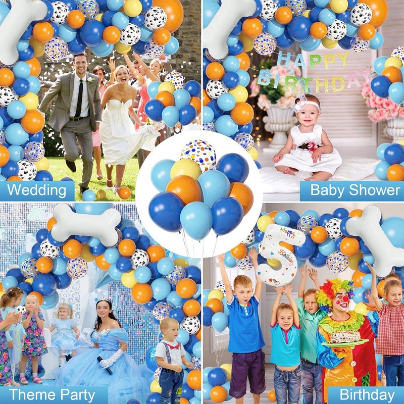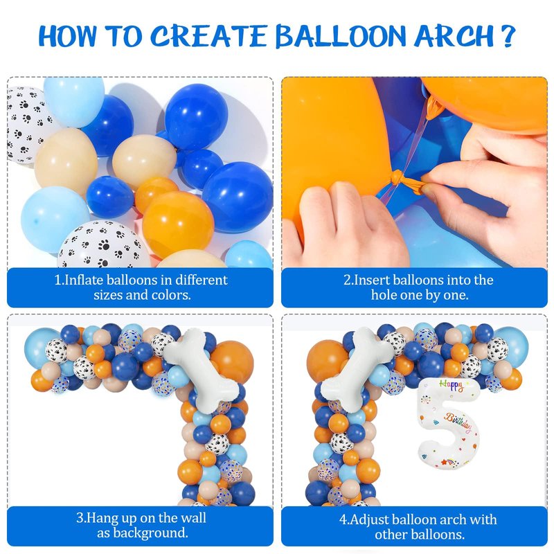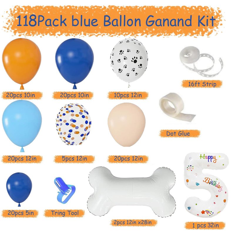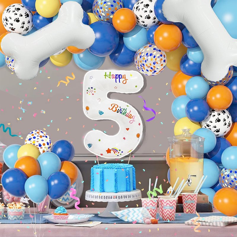 - Package content and size information: you will receive 1pcs 32 Inch 5th Birthday Balloon and 2 bone foil balloon,10 latex 12" dog paw print balloons,5pcs 12" confetti balloons,40pcs 12" light blue/yellow balloons,40pcs 10" dark blue/orange balloons,20pcs 5" dark blue balloons, Super value!