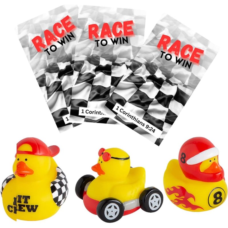 - 12 count of high-quality Vinyl Race Car Driver Rubber Ducks and Race to Win Bible verse cards in each bulk count.