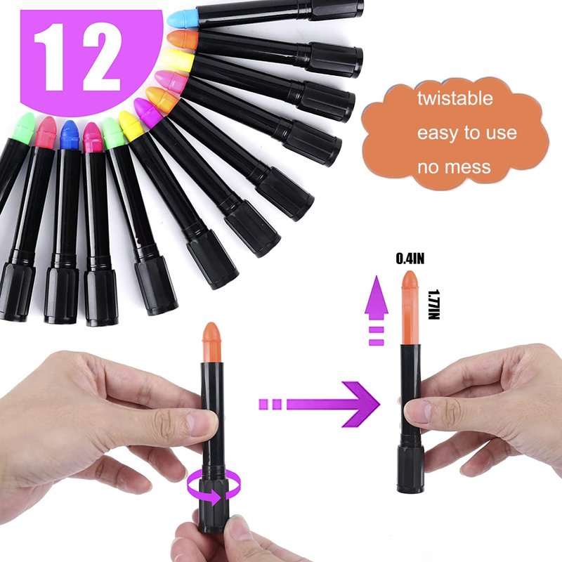 - Easy to Use and Wash: Glow in The Black Light Body Face Paint are very easy to apply on the skin. Crayons have a twistable design, which can be twisted and adjusted to fit your body or face. Non-toxic face painting kits for kids crayons can be easily washed by soapy water.