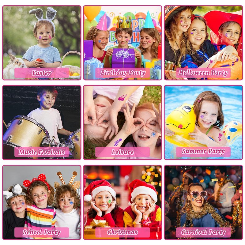 - 🌹 ★【High Quality Glitter】 Girl Tattoo Sequins are skin-friendly and waterproof, safe to use on face, arms, shoulders, hands and nails. Not only for children, adults can also enjoy the fun and art from temporary fashion glitter tattoos. Suitable for birthday parties, summer parties, luau parties, carnivals, rave parties, stage performances, children's day, Halloween, Christmas, cosplay and so on.