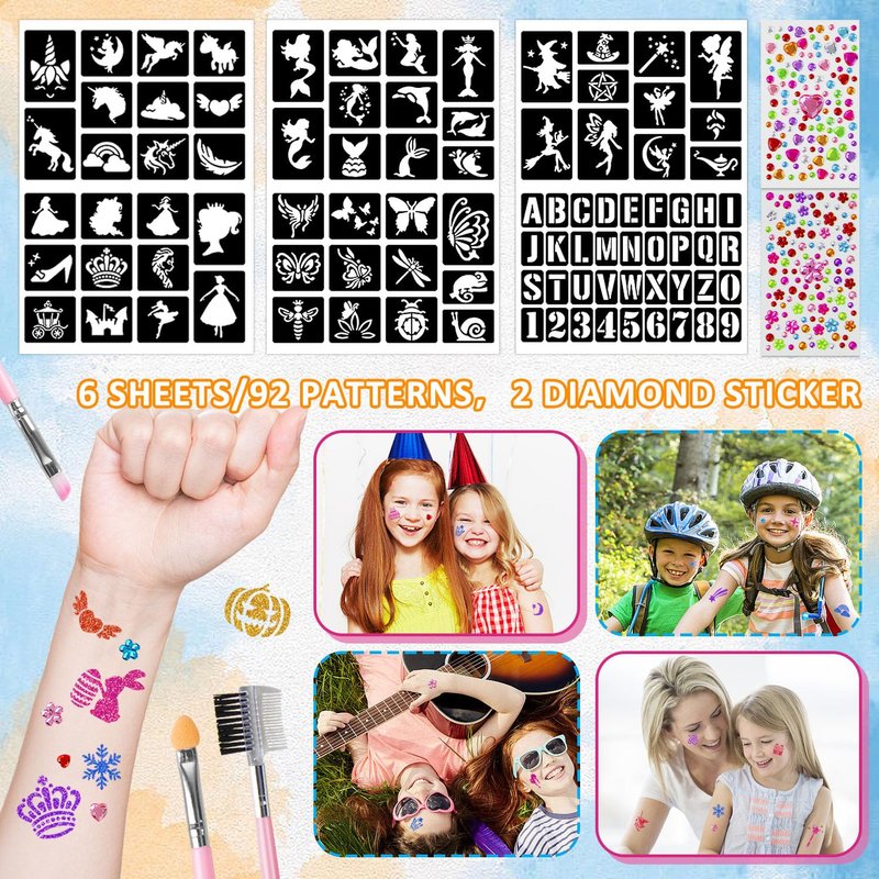- 🎁 ★【Perfect Gift for Giving】This glitter tattoo kit contains enough kits, have fun creating unique art and exciting tattoos with your friends and family! Make you unique and sparkling throughout the party. Suitable for those who love shiny things, the cute gift box set design is a perfect gift for girls or boys as a birthday gift, children's day gift, Christmas gift and so on.