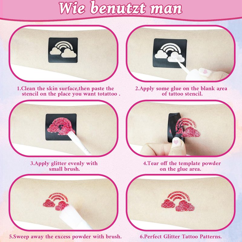 - ✅ ★【Cautions】 The effect lasts 3-7 days. Sensitive skin and children under 3 years of age need to do a test before use.【instructions for use】1.Stick the template on the part to be tattooed 2.Apply a small amount of glue and wait for the glue to become transparent 3.Apply glitter evenly with a small brush 4.Remove the template and use a large brush to sweep off the excess glitter. Easy to clean and will not damage your skin. Temporary tattoos can be removed with soap and water or makeup remover.