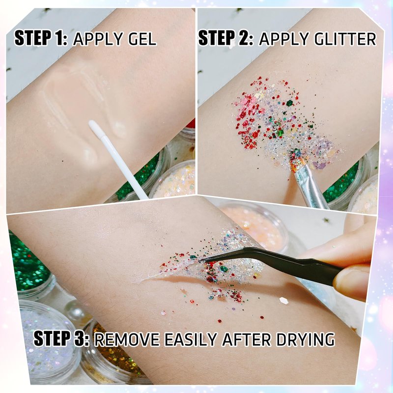 - What You Get: You will receive 12 pots with 5g of cosmetic glitter in each color, quite enough for multiple times deco, also, 10ml quick dry glitter glue gel & a makeup brush are included.