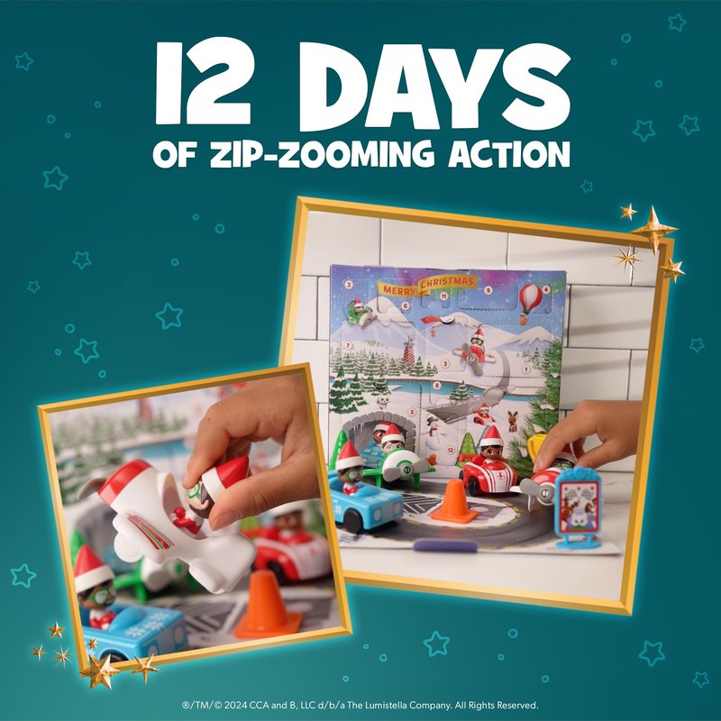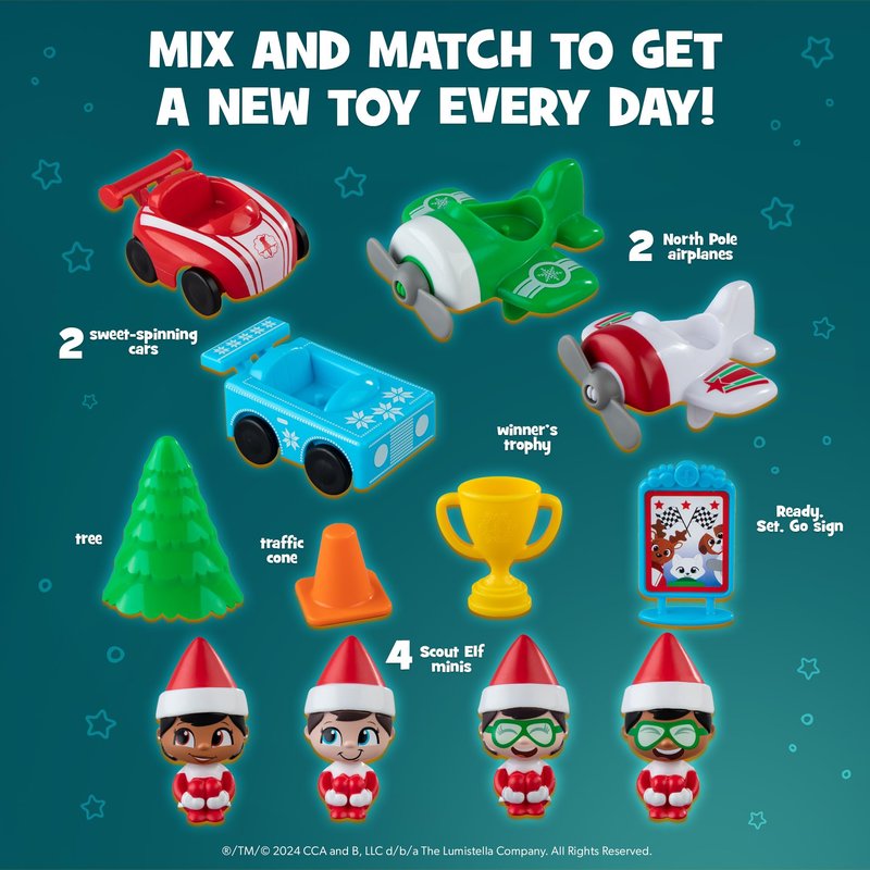 - 12 Days of Surprises: The Elf on the Shelf countdown calendar revs up the season with our speed-loving team of racers straight from the North Pole. Mix and match your drivers, planes, cars, and accessories for 12 days of zip-zooming action to Christmas. This is a Christmas advent calendar kids will keep looking forward to.