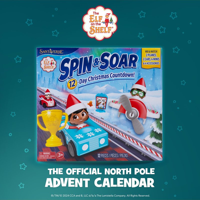 - The Elf on the Shelf Christmas Countdown Calendar: The race is on! The Elf on the Shelf Spin & Soar set includes The Elf on the Shelf toys you can mix and match for 12 days leading to Christmas day. Get 4 Scout Elf mini-figures, vehicles, and accessories for one fun calendar for kids 3 years and above.